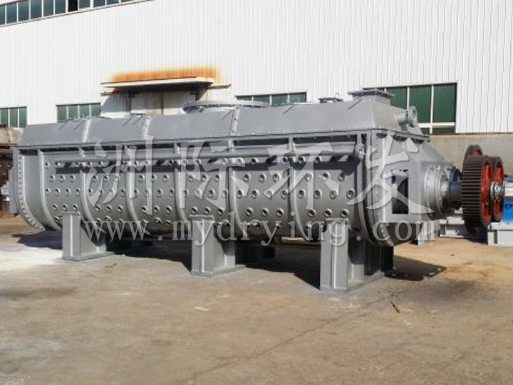 空心軸上密集排列著楔型中空漿葉,熱介質(zhì)經(jīng)空心軸流經(jīng)漿葉。單位有效容積內(nèi)傳熱面積很大,熱介質(zhì)溫度從-40℃到320℃,可以是水蒸汽,也可以是液體型:如熱水、導(dǎo)熱油等。間接傳導(dǎo)加熱,沒有攜帶空氣帶走熱量,熱量均用來(lái)加熱物料。熱量損失僅為通過(guò)器體保溫層向環(huán)境的散熱。楔型漿葉傳熱面具有自清潔功能。物料顆粒與楔型面的相對(duì)運(yùn)動(dòng)產(chǎn)生洗刷作用,能夠洗刷掉楔型面上附著物料,使運(yùn)轉(zhuǎn)中一直保持著清潔的傳熱面。漿葉干燥機(jī)的殼體為Ω型,殼體內(nèi)一般安排二到四根空心攪拌軸。殼體有密封端蓋與上蓋,防止物料粉塵外泄而充分發(fā)揮作用。